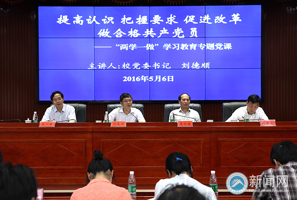 5月6日下午,校党委书记刘德顺在综合楼五楼报告厅以“提高认识 把握要求 促进改革 做合格的共产党员”为题主讲“两学一做”学习教育专题党课。校长李伯超、校党委副书记朱川曲、纪委书记刘宇文与会,党务部门处级领导干部、直属党委(党总支部)书记、副书记、组织委员,教工党支部书记等党员干部到场聆听。