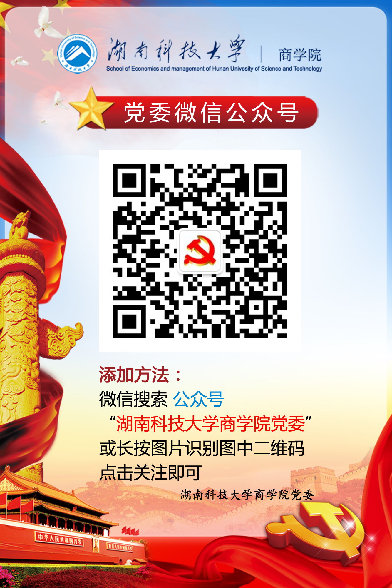 【商学院党委微信公众号添加方法:打开微信客户端,搜索公众号“湖南科技大学商学院党委”,也可直接二维码扫描以下图片,点击关注。】