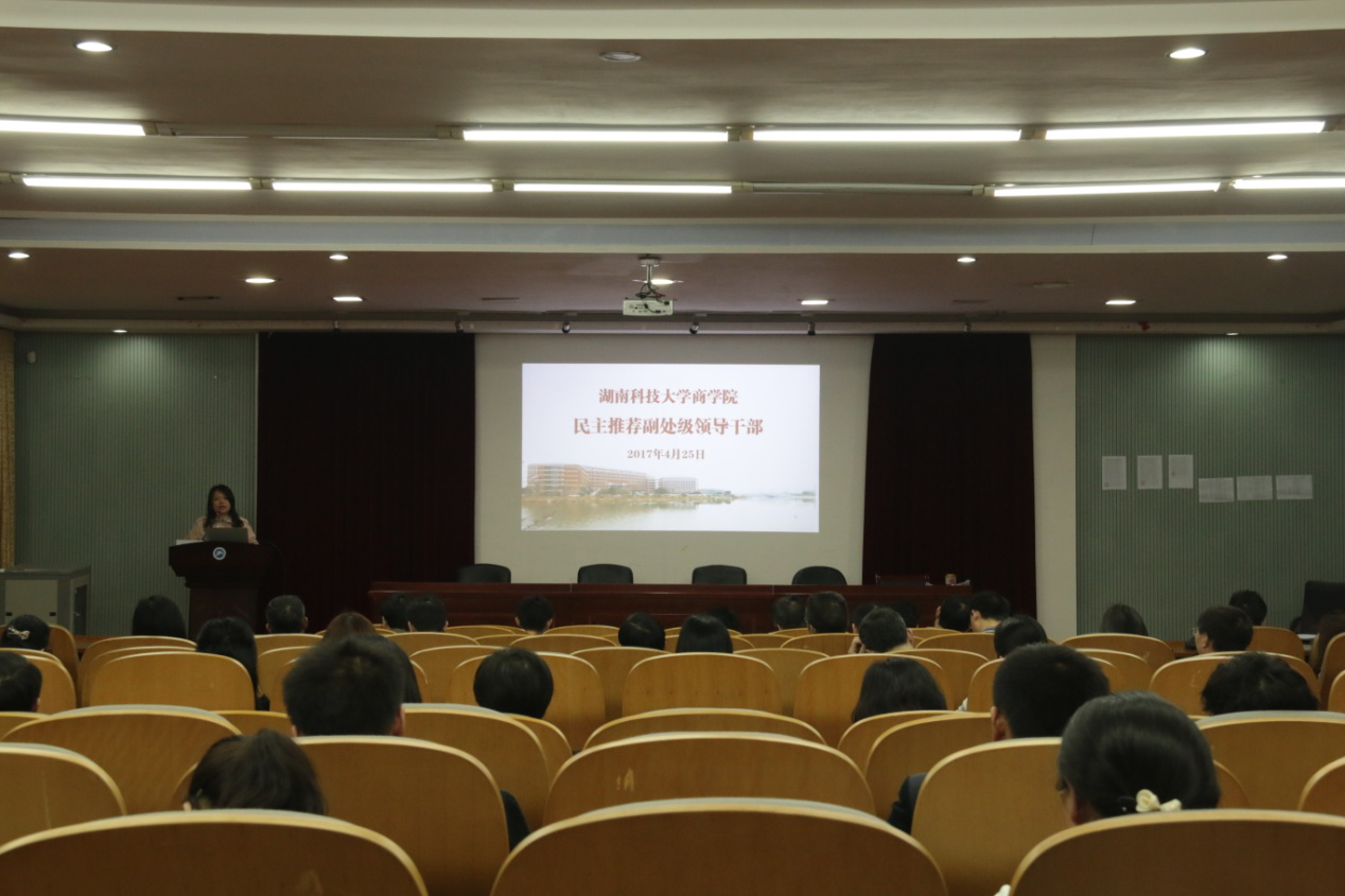 2017年4月25日,我院在三教楼101会议室召开综合性管理岗位副处级领导干部民主推荐会。会议由院党委书记仇怡主持,学校组织部向大顺副部长、商学院全体教职工参加了此次会议。