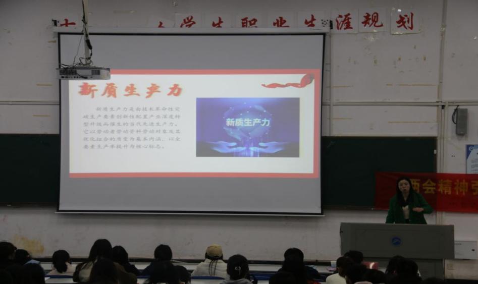党建组织员蔡美玲聚焦“全国两会热词”为学生党员们进行解读,她激励全体学生党员:“新时代青年党员要以‘两会精神’为思想引领,持续铸牢‘绝对忠诚’的政治品格,不断练就‘善作善成’的过硬本领,以青年党员之担当奋力谱写中国式现代化新篇章。”