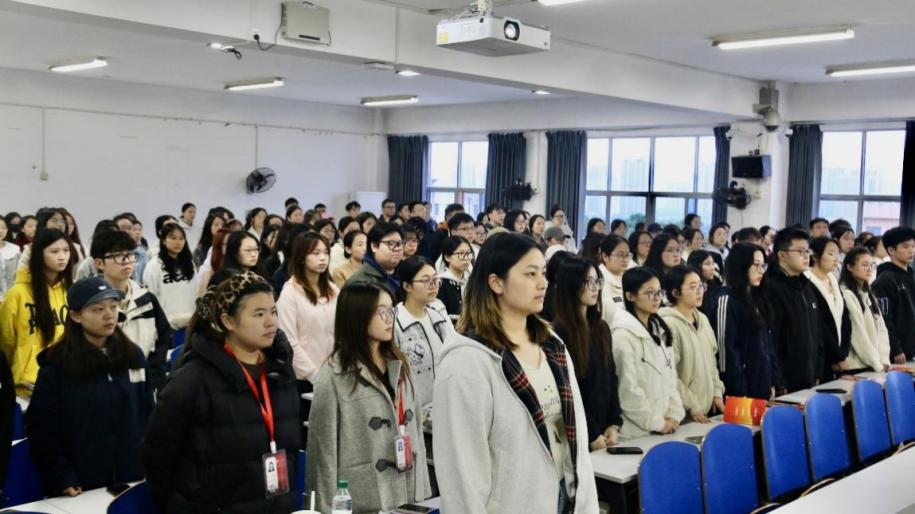 曲毕,会场内霎时静穆。学生党员代表廖璇带领大家面向鲜红的党旗郑重举起右拳,重温入党誓词。全体学生党员目光坚定、神情肃穆,“我志愿加入中国共产党……”字字铿锵、句句千钧的誓言在会场中激荡回响,赤诚的信仰在誓言中淬炼,滚烫的初心在党旗下闪耀。
