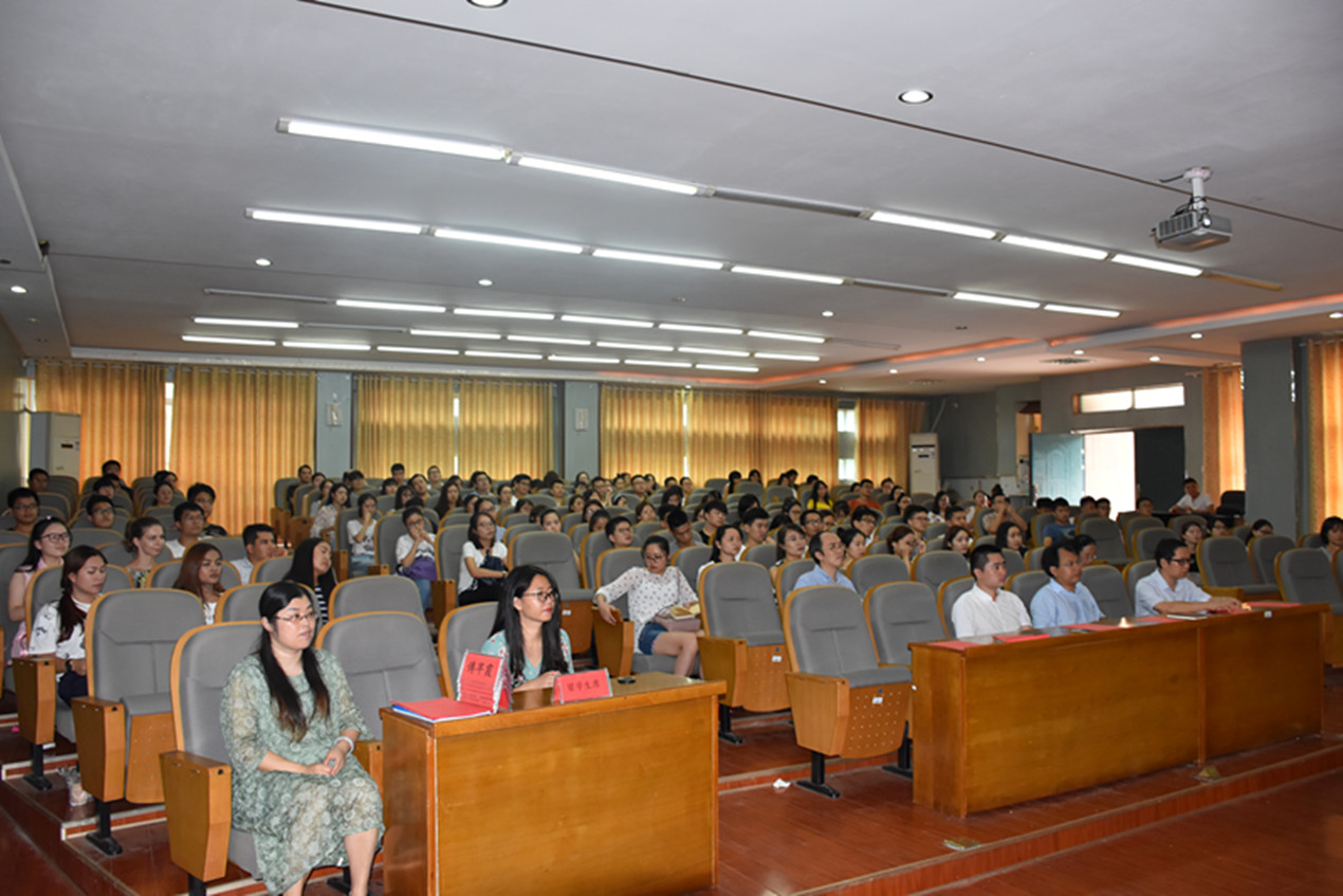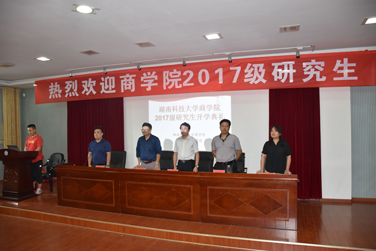 2017年9月10日下午3:00,商学院2017级研究生开学典礼于三教101学术报告厅隆重举行。会议由商学院党委书记潘爱民教授主持,湖南科技大学副校长胡石其教授、社科处处长向国成教授、图书馆党委书记彭清华教授出席典礼,商学院院长仇怡教授、副院长颜剩勇教授、党委副书记傅早霞老师、副院长贺胜兵教授、副院长邓淇中博士及部分导师代表、2017级硕士研究生、博士研究生和留学生参加了典礼。
