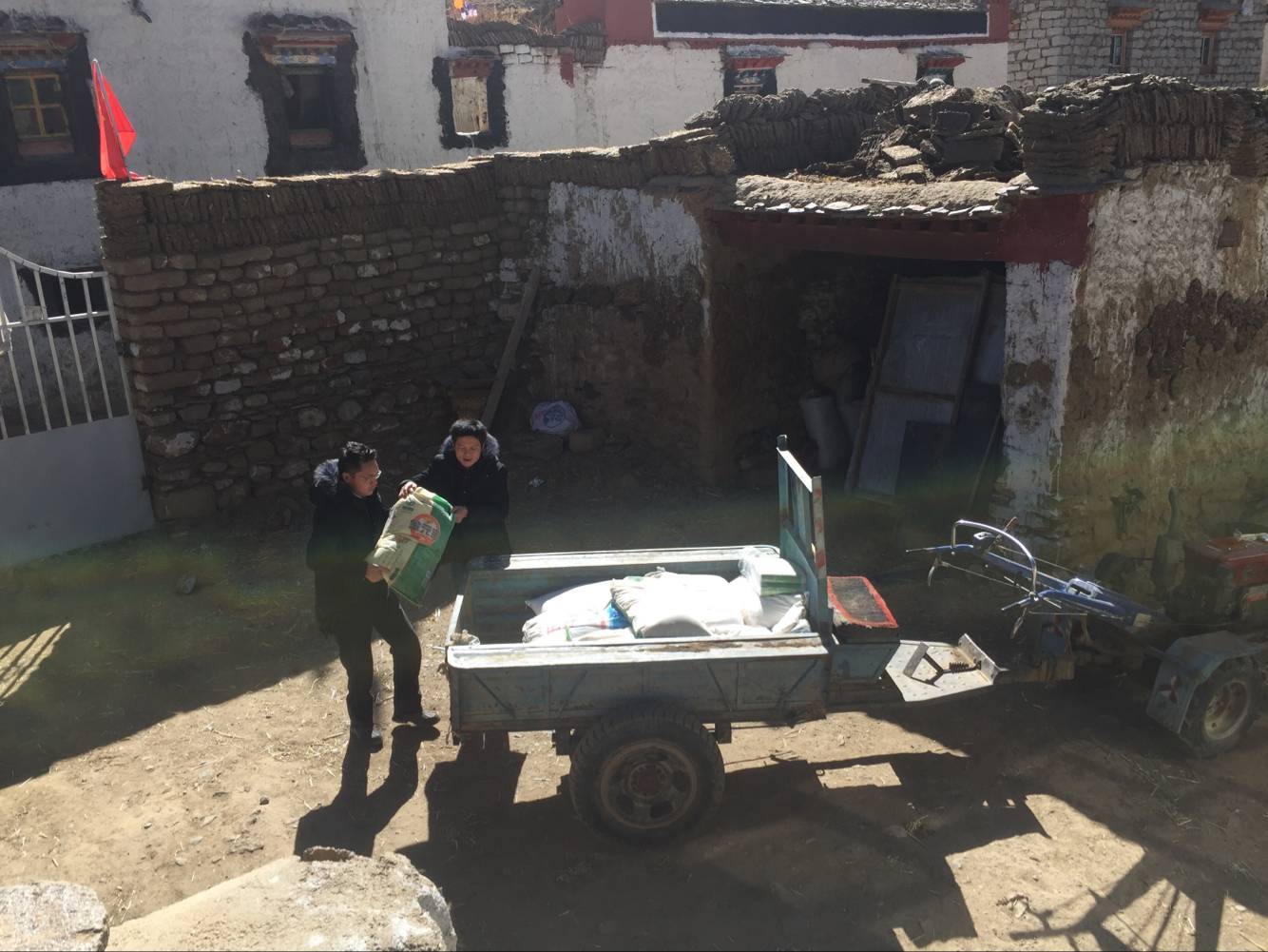 商学院党委副书记傅早霞和学工办主任陈攀搬运生活物资赠送石达普尺家