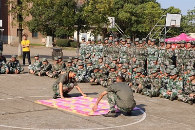 为了确保每一位学生都能够清晰、直观地观看整个叠被的全过程,吴锋龙让百余名学生围成四方型,他置身其中,边叠边讲解。活动开始后,教官首先对叠被的意义及关键点进行了阐述,他指出:“一床优秀的被子必须经过量、掏、擀、折线等过程,每一步环环相扣,必须仔细认真,确保每一步都有坚实的基础。”随后教官对叠被的过程进行了演示,在短短的三分钟内,一床凌乱的被子顿时变得菱角分明,同学们都佩服不已。他强调,叠被子讲究“三分叠七分修”,叠好被子容易,想达到应有的标准则需要一定的细致与熟练,这也是一个培养同学们耐心的机会。