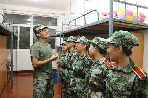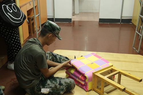 10月4日晚19:20,新生寝室迎来了他们的第一批“客人”――他们敬爱的教官。“教官好”,女生寝室新生分列两边礼貌地向教官问好。看到他们一副惶恐的样子,一营一连一排长教官吴锋龙笑道:“不用那么紧张,都放轻松,来个人跟着我,记下打扫卫生时候需要注意的地方。”吴锋龙细心地检查并指点了那些容易被忽略的角落,并对部分寝室的“豆腐块”提出了表扬:“可以啊,这棱角都出来了,很不错。”男生寝室里十二排排长吕新斌还亲自示范了“豆腐块”的叠法。