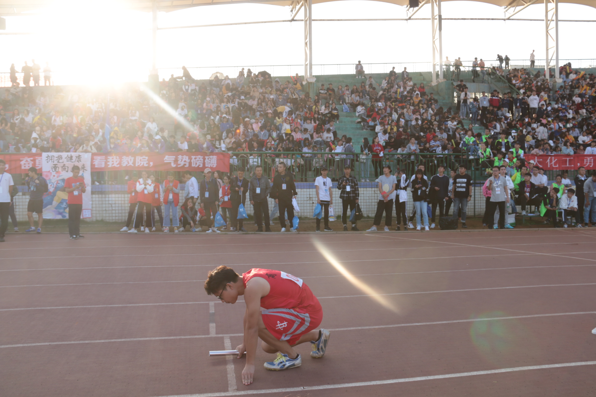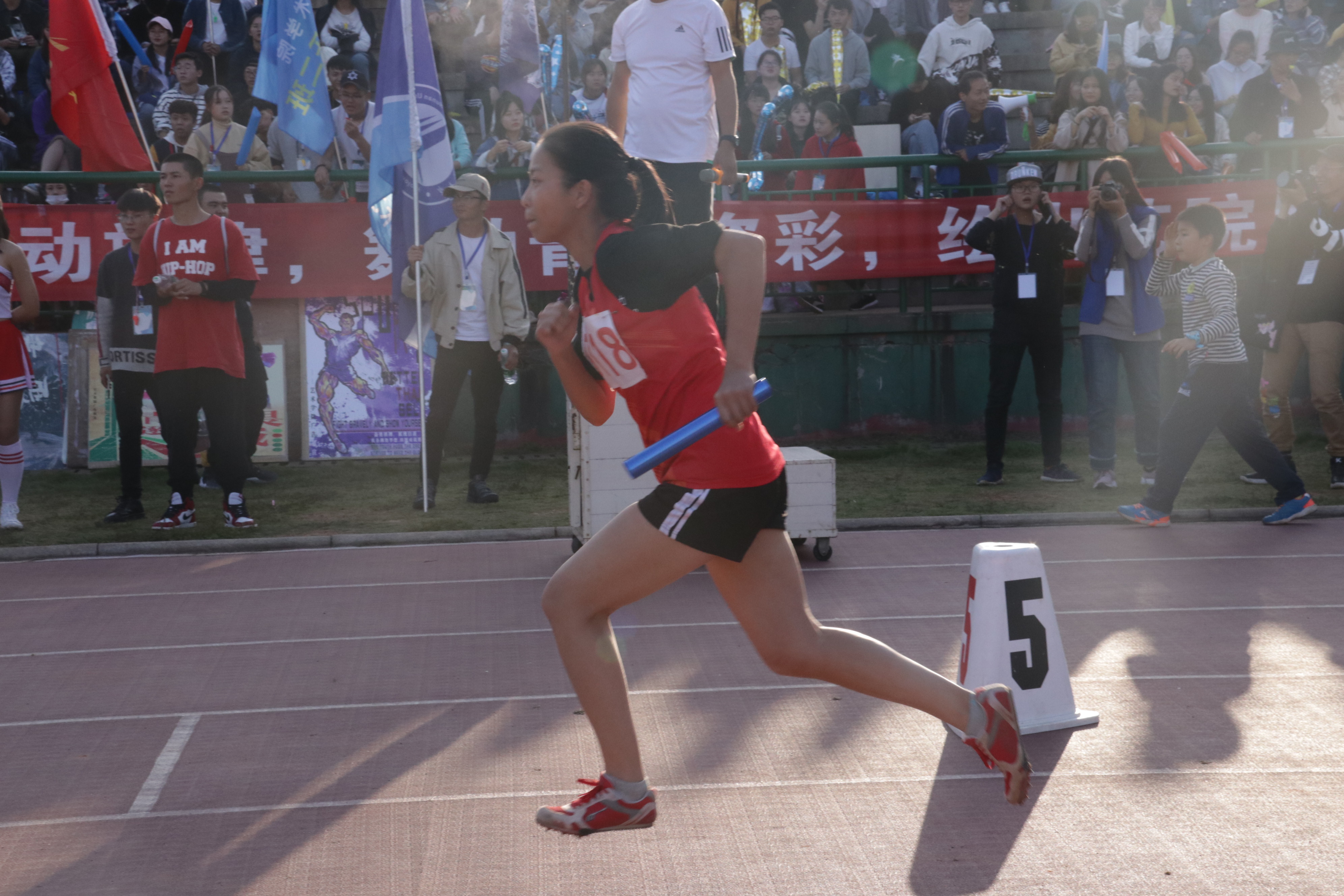 赤色环形赛道上,运动健儿们摩擦着拳脚,毫不示弱。赛道外,同学们的呐喊助威之声不绝于耳。“砰!”一声枪响伴着飒爽的秋风出现。梁思婷蹬地,迈腿,摆臂,健步如飞,实力远超对手。王思为目光坚定,奋力冲刺,毫不退缩。最终,女子组摘得本次运动会4×100接力赛的桂冠,男子组也取得了第五名的好成绩。