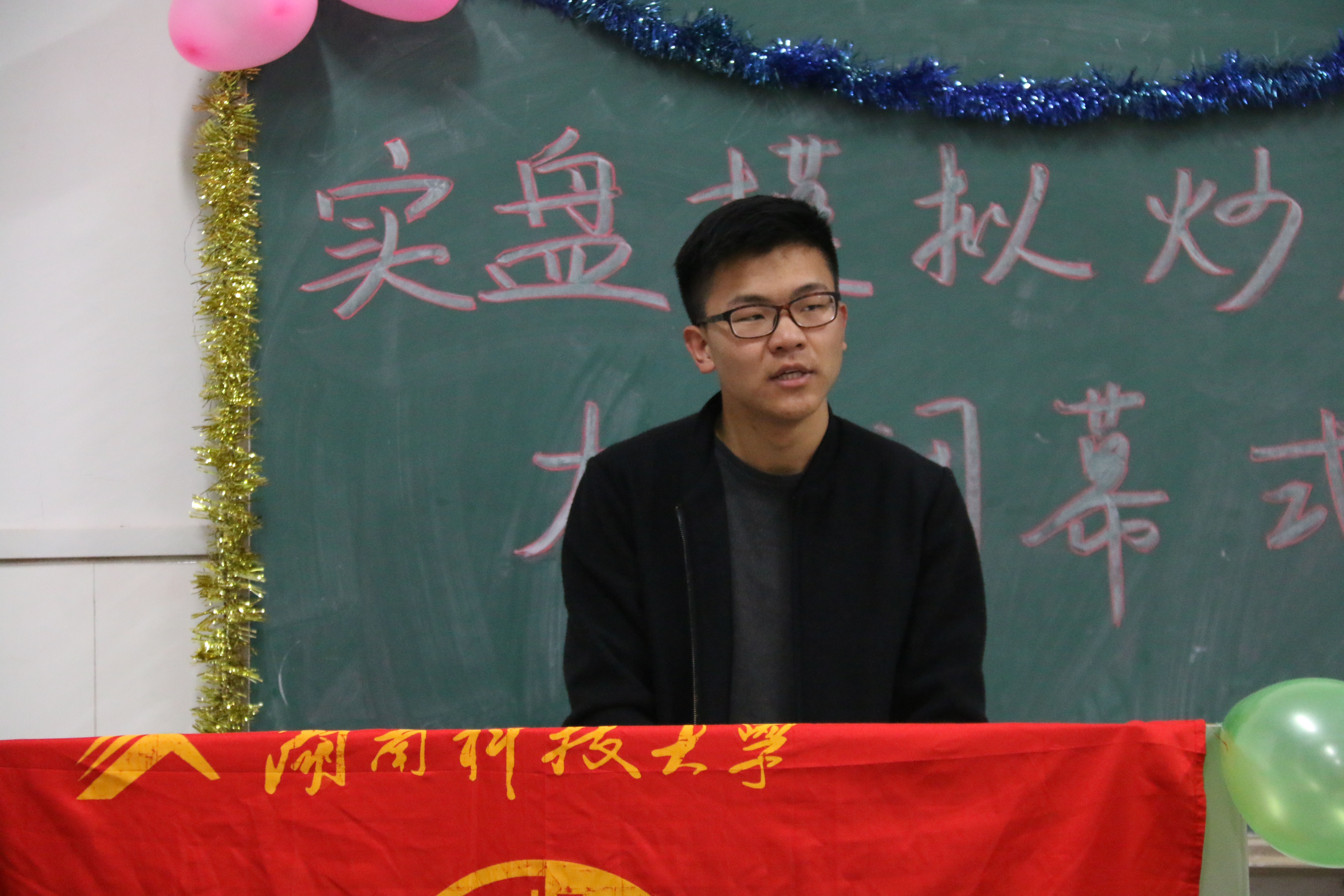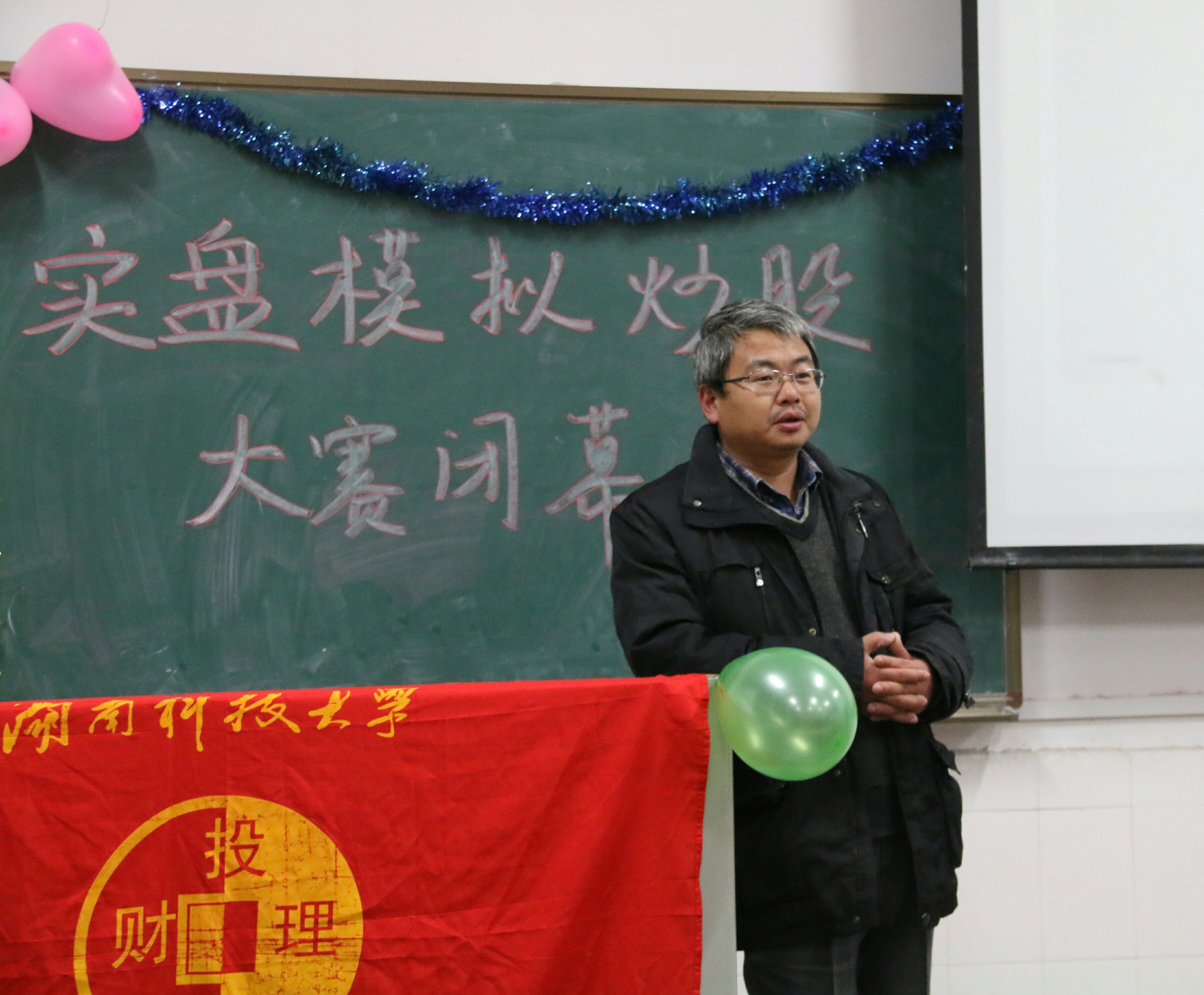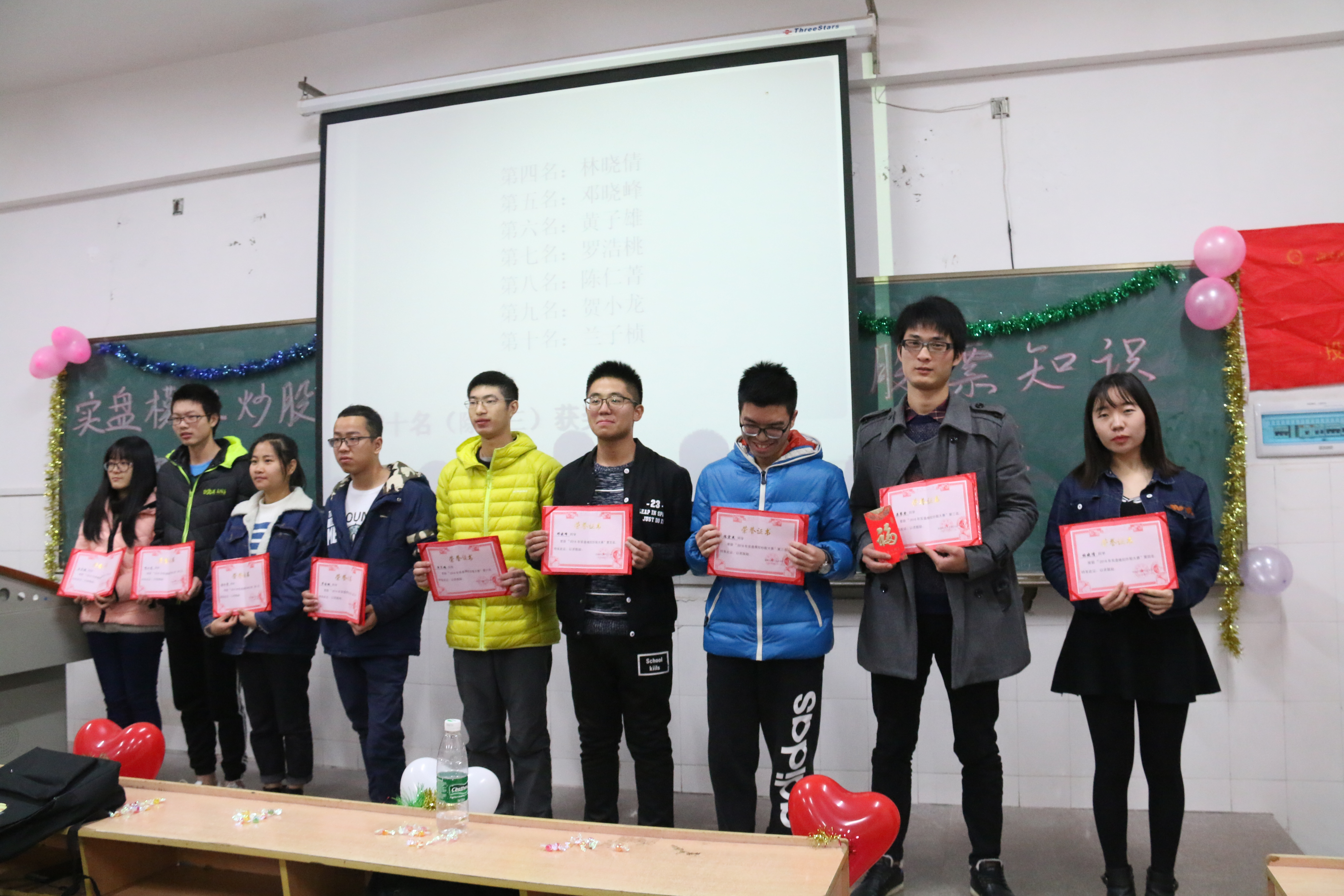 本次活动邀请了来自商学院的陈为民老师为在座同学详细讲解了股票知识。陈老师用生动风趣的语言给大家讲授了一系列炒股市场的信息,从不知名小企业到香港知名大公司,从西部大开发到“一带一路”战略……随后,由主持人宣布比赛结果,陈旭东、栗攀登和陈宏杰分获冠亚季军。三位优胜者上台向同学们传授自己成功经验,同时,也用事实例证告诉我们盲目无节制炒股带来的危害,强调了“股票有风险,投资需谨慎”的理念。