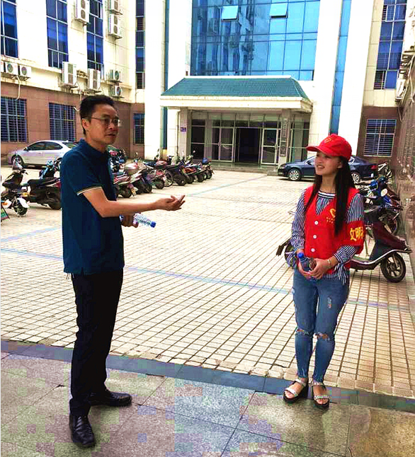 “帮助别人就是帮助自己。谢谢你们的爱心,你们辛苦了!”在三教门口,傅早霞与在岗的创文志愿者亲切交谈,详细询问志愿者的服务内容、志愿经历、服务感受、后勤保障等方面情况,并送上了矿泉水等物资。