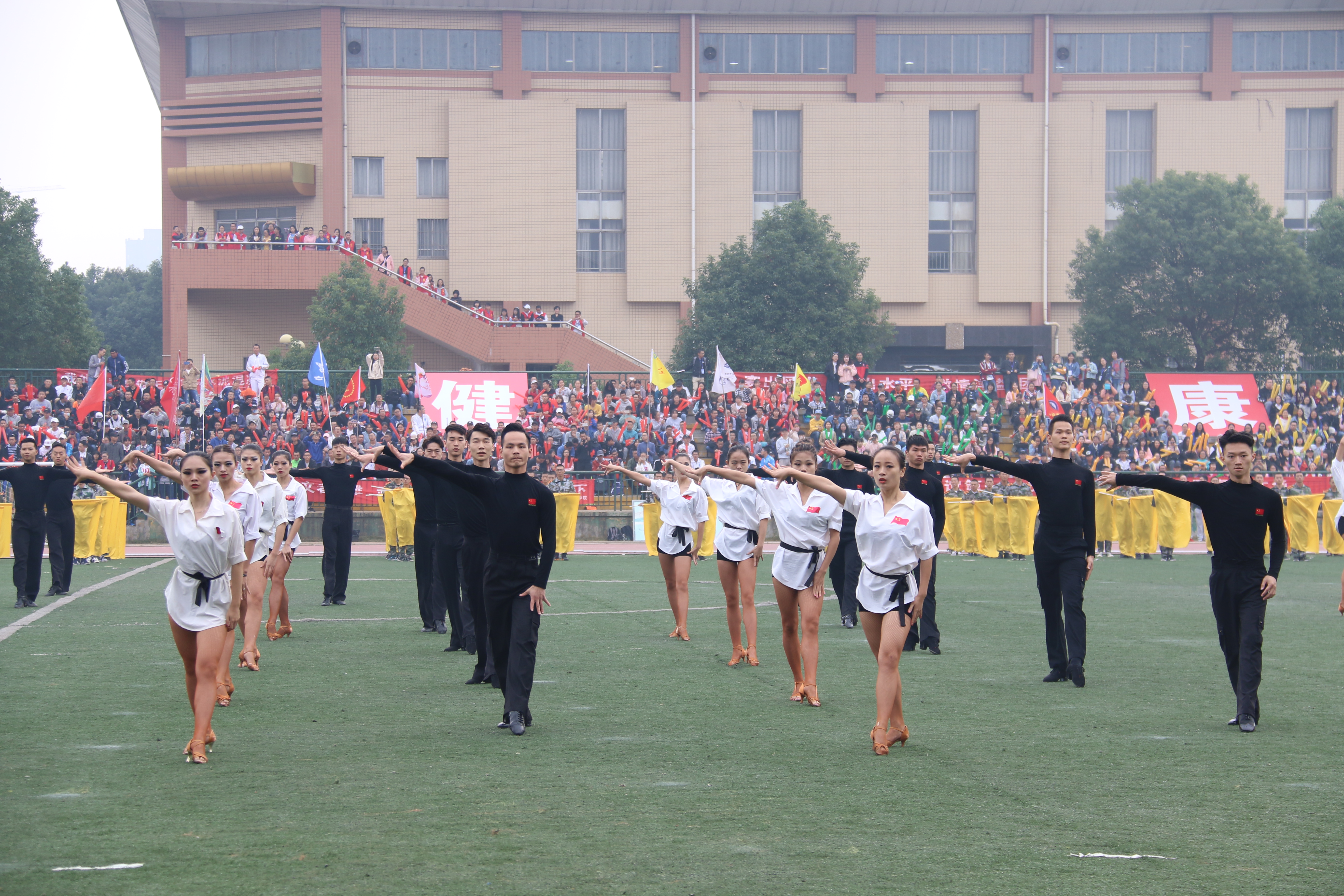 欢腾雀跃的彩旗队表演,喜庆祥和的舞龙舞狮,柔中带刚的交谊舞,俏皮性感的啦啦队以及由教职工带来的活力四射的健美操表演都展现了我校师生精神风貌,比赛也随之拉开帷幕。