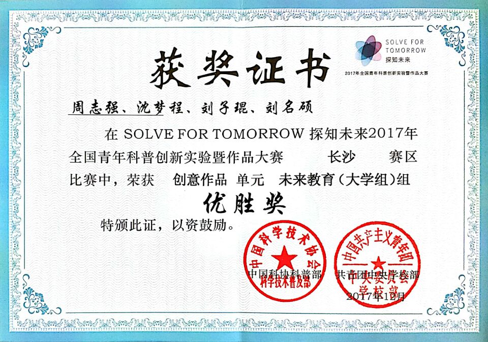 我院由陈湘州老师指导,张苏伟、洪孝益、许玉琦组成的“未来我来”团队的作品《全息多维度教学》和由周志强老师指导,沈梦程、刘子琨、刘名硕组成的“we are the future”团队的作品《让3D上课堂》通过激烈角逐,皆荣获长沙赛区复赛优胜奖。《全息多维度教学》在全息技术的基础上,以互联网数据为支撑,实现教育资源同步更新。《让3D上课堂》则为通过现代3D技术与多媒体进行蓝牙链接来实现无差异化教学的一款新型眼镜。