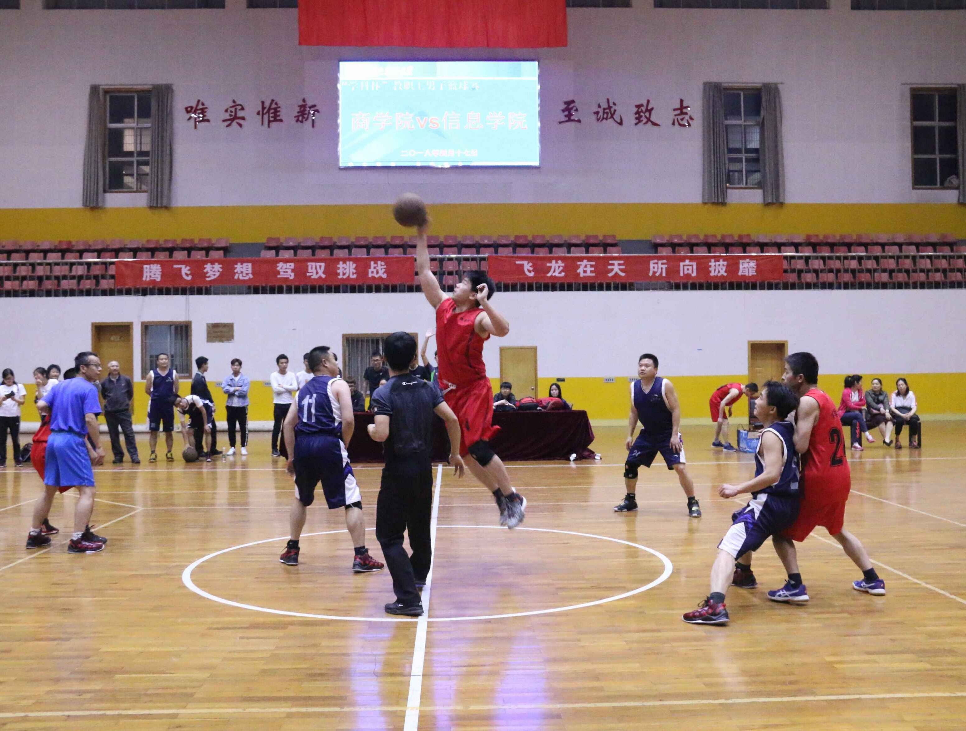 4月17日19:40,“学科杯”教职工男子篮球赛商学院代表队和信息学院代表队在北校体育馆内火热开赛。商学院院长仇怡、党委书记潘爱民等各位老师以及商院学子来到比赛现场为我院参赛的教职工队员加油助威。