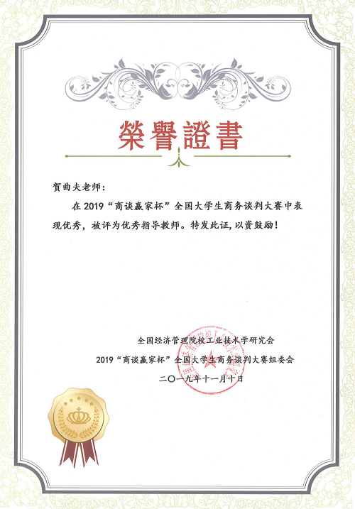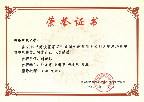 2019年11月9-10日,全国经济管理院校工业技术学研究会沟通与谈判委员第七届学术年会暨2019“商谈赢家杯”全国大学生商务谈判大赛总决赛在山西省太原市中北大学举行。我校由商学院国贸、电商、经济等专业同学组成的月湖队(向景宇、夏敏航、郑亦佳、吴谭)和明镜队(许小婷、刘锡苓、钟美琪、李彪)经过多轮拼搏,分别荣获团队二等奖和三等奖,明镜队还荣获大赛优秀奖,指导老师王琼和贺曲夫均被评为“优秀指导老师”,成绩喜人。