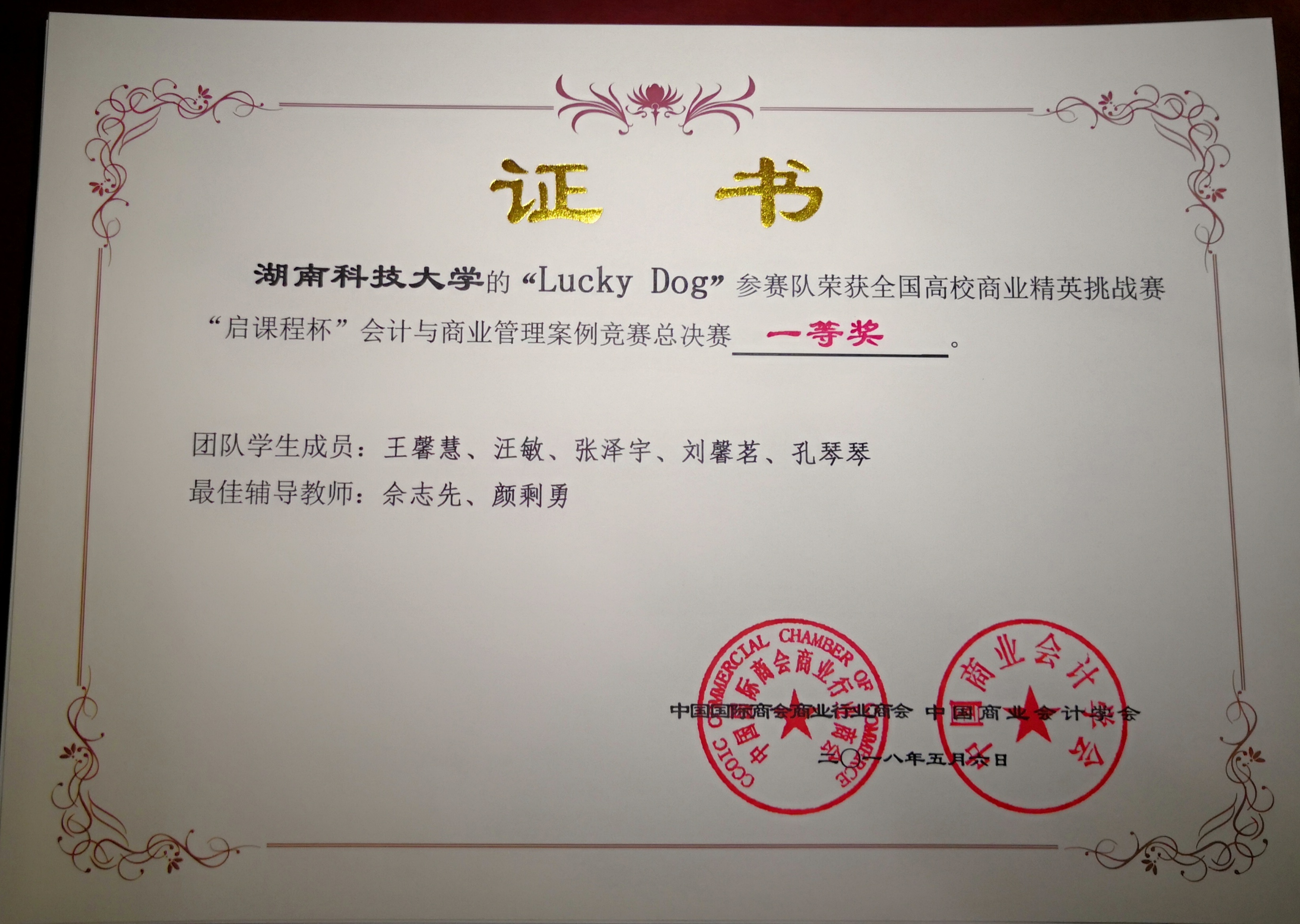 5月4日至6日,2018年全国高校商业精英挑战赛“启课程杯”会计与商业管理案例竞赛总决赛在哈尔滨成功举办,由来自湖南科技大学商学院的王馨慧、刘馨茗、张泽宇、汪敏、孔琴琴组成的“Lucky Dog队”以作品《让途牛 niu起来》荣获本次大赛一等奖,我校商学院会计系老师佘志先与颜剩勇担任其指导老师。