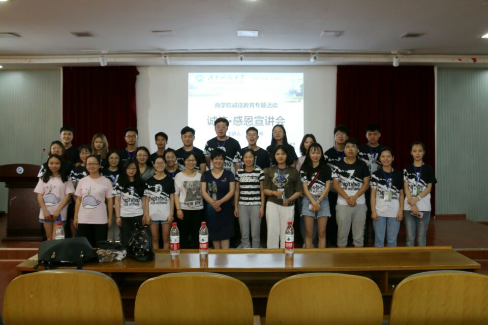 5月28日12:30,由湖南科技大学商学院团委学生会主办,团委基金会承办的“诚信·感恩”诚信宣讲会,于第三教学楼101学术报告厅成功举行。此次会议由法学与公共管理学院朱荣老师主讲,校大学生资助办公室邵淑珍老师、商学院团委基金会指导老师雷芳老师与会,商学院2017级班团和全体贷款学生参加此次会议。