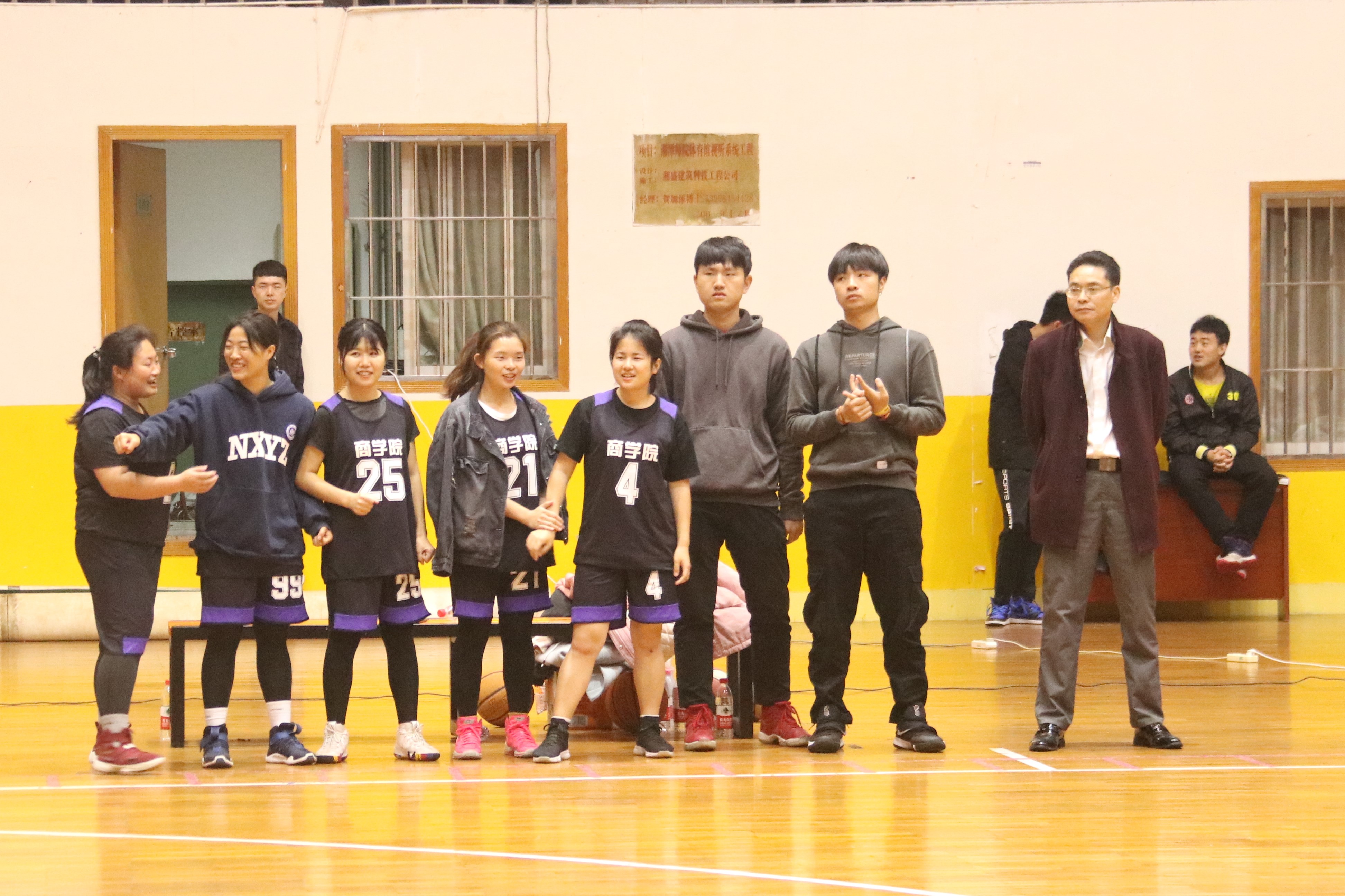 2019年4月28日晚上19:00,湖南科技大学校首届“新青年杯”学生篮球联赛女篮决赛于北校体育馆举行。本场比赛亦是商学院和潇湘学院的冠军之战,商学院党委副书记傅早霞亲临现场为球员们加油。